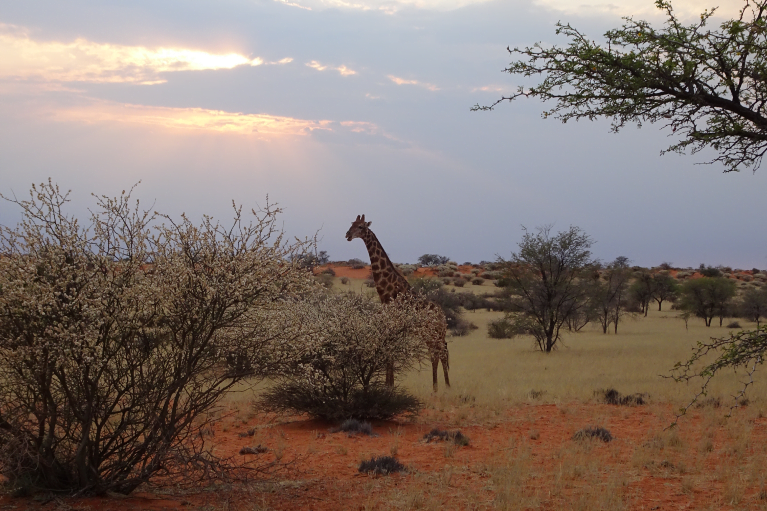 In de Kalahari is de natuur puur en onaangetast. Het lijkt op een woestijn, maar er valt teveel regen om deze titel te mogen dragen. Als er water valt, zakt dan zakt dit gelijk naar ondergrondse reserves, waardoor het landschap er droog en heet uitziet. Maar in het regenseizoen bloeit de Kalahari letterlijk op. Het kenmerkende rode zand verdwijnt onder een deken van groen. Het gras begint te groeien en de bloemen verschijnen. Wij waren er zelf in het droogseizoen en het is bijna niet voor te stellen dat het rode zand enkele maanden later plaats maakt voor een groene oase. Wat een wereld van verschil.