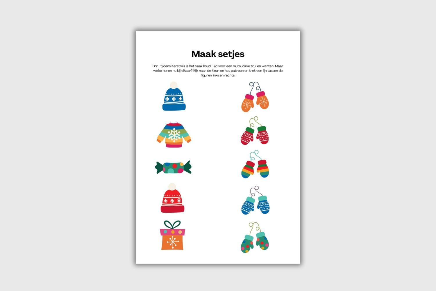- Kleuren en patronen herkennen: ga spelenderwijs aan de slag met het herkennen van kleuren en patronen door setjes te maken van kerstbomen en bijpassende kerstballen. En kledingsetjes van wanten, truien en mutsen.