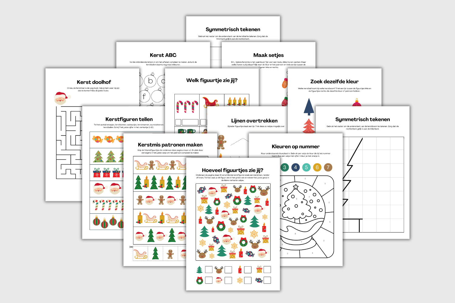 Op zoek naar een leuke én leerzame activiteit voor de kleintjes in aanloop naar Kerstmis? Deze set van 12 Kerst werkbladen is precies wat je zoekt! De werkbladen zitten boordevol gezellige Kerst-oefeningen zoals tellen, patronen maken, een doolhof, symmetrisch tekenen en kleurensetjes maken.